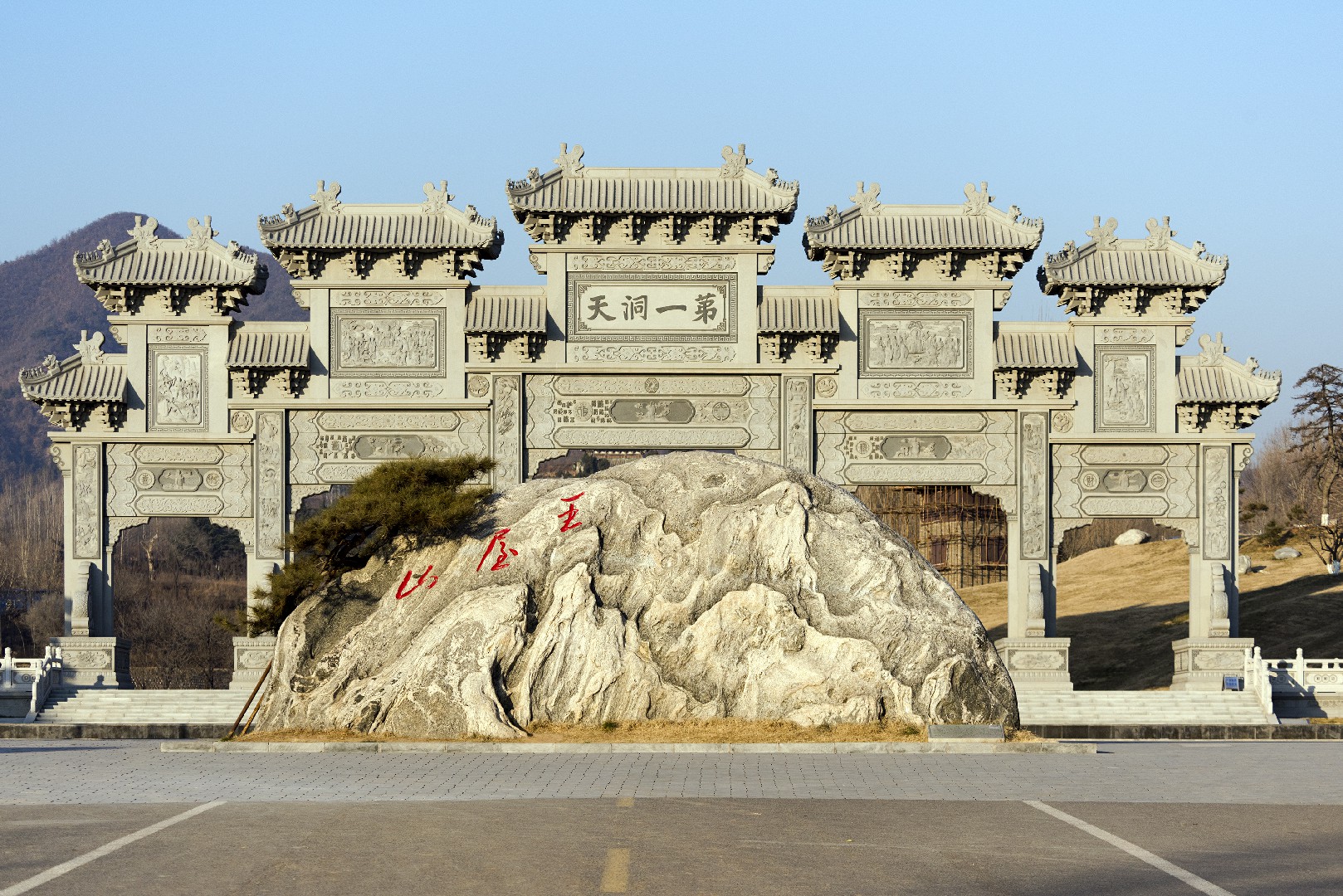 영빈광장은 ‘천하의 귀빈을 맞이한다’는 뜻을 지니고 있습니다. 왕우산이 한 권의 역사서라면, 영빈광장은 그 해설의 서문과 같습니다. 복희가 팔괘를 연역하고, 황제가 천단에서 제사를 지낸 이래로 왕우산은 줄곧 중화문명과 함께 걸어왔습니다. 열자가 저술하고, 상산사호가 은거하며, 하상공이 주를 달고, 손사막이 의술을 펼친 일들 모두가 왕우산에서 이루어졌습니다. 영빈광장은 상황적·상호작용적·체험적·전시적 기법을 복합적으로 활용하여 ‘천하제일동천’의 의경을 재현함으로써, 왕우산의 첫인상 구역으로 자리매김하고 있습니다. 영빈광장은 1000여 무의 부지에 조성되어 있으며, 중앙 축선에는 제1동천패방, 오행사상광장, 천기고정, 초단, 정천문, 헌원전, 양대궁 등 북두칠성에 대응하는 7개의 주요 건축물이 자리합니다. 양측의 왕우산 문화체험구에는 도덕경 석각, 황제 제천 조각상, 명인 시사문화 장랑 등이 조성되어 있습니다.