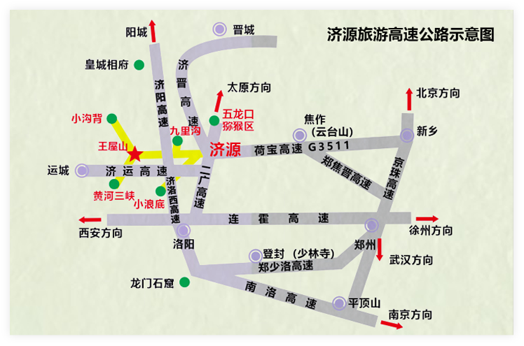 走京珠高速到新乡,转长济高速到济源东下高速,直走济水大道至天坛路右转,至济邵公路(S312)左转,直走40公里(或转济邵高速王屋山站下高速,右转直走3公里)即到。