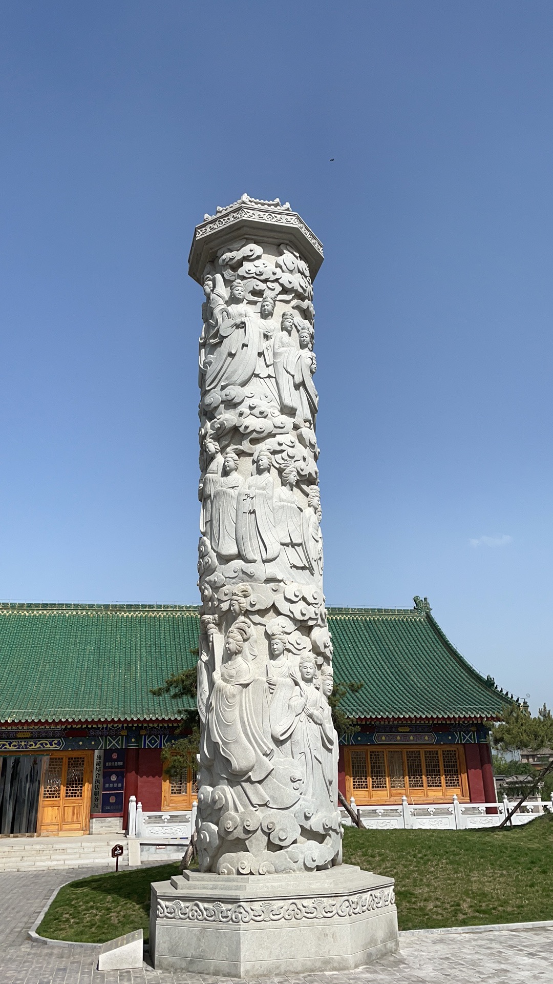 朝元仙杖柱は花崗岩を精選し、高さは12メートルで、上には朝元仙杖図が彫刻されている。五方帝君の東華帝君、南極大帝、扶桑大帝が天の最高支配者である元始天尊に謁見する壮大な場面を描いている。歴史上で2人しか朝元仙戦図を描いたことがある。一人は唐代の有名な画家呉道子で、彼が87名の神仙を描いた。あとの一名は宋代の有名な絵師武宗元である。彼は済源人で、呉道子87神仙図に基づいて創造を加え、88名の神仙を描いた。我々が今見ているのは武宗元の88神仙図である。