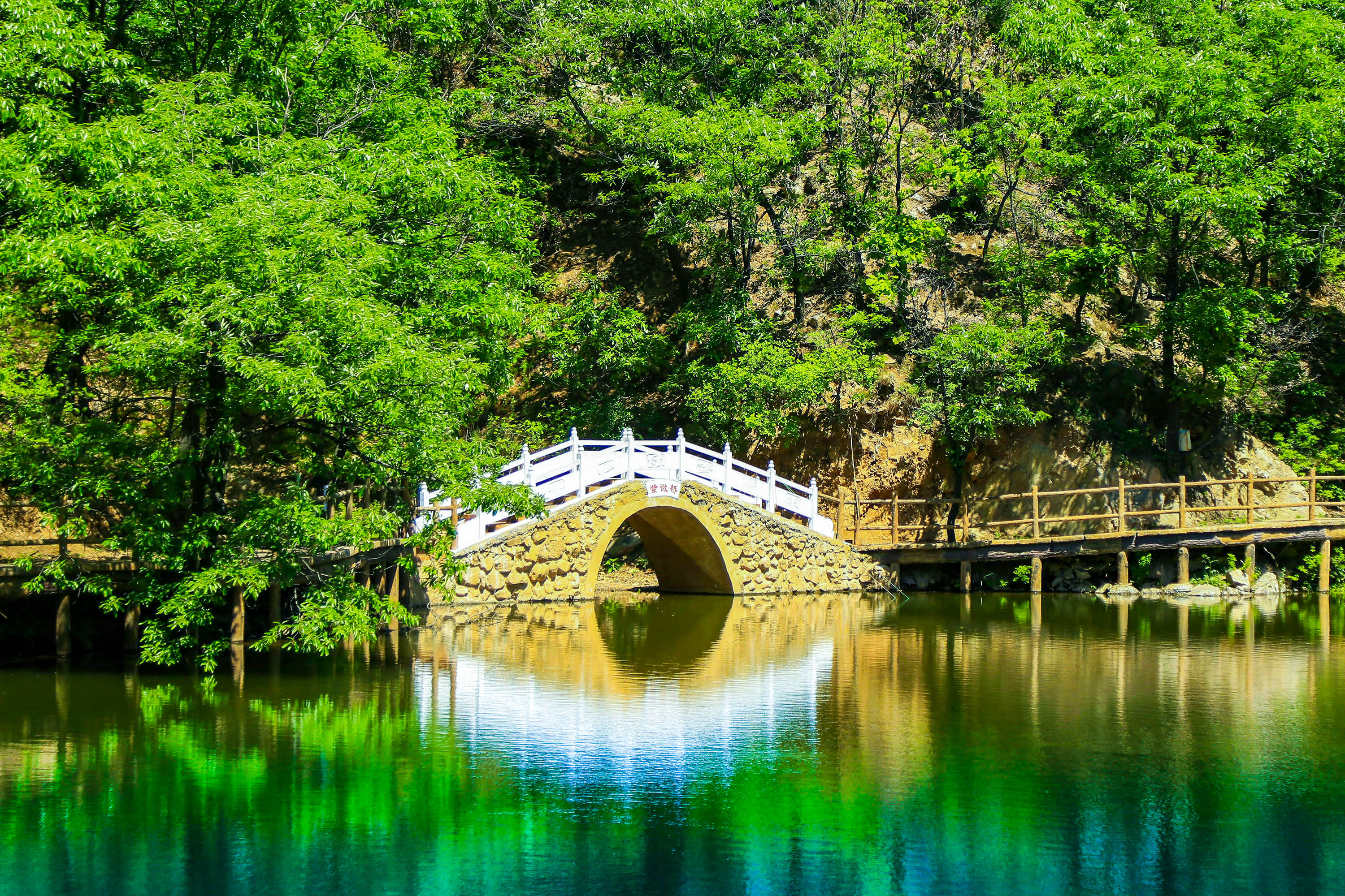 紫微宮に近いことから名づけられた。湖水は鏡のように澄みきっていて、青山の緑の木に囲まれて、波の光と山の色が互いに照り映えて趣がある。湖畔の桟道がくねくねしていて、その間を歩くと湖の景色を楽しむことができる。