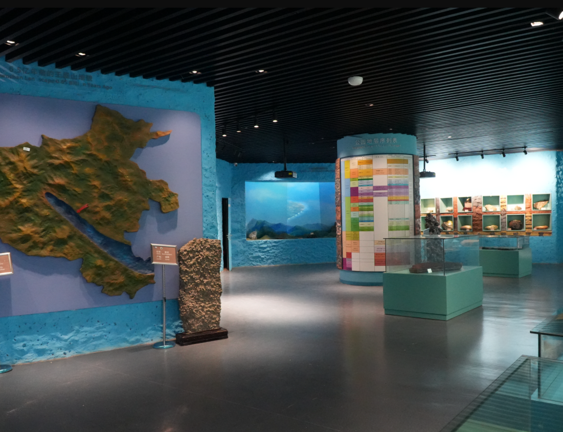 창해상전관은 조경, 영상, 조각 모형 등의 연출 기법을 활용하여 지금으로부터 약 14억 년 전부터 약 5억 년 전까지 왕우산-다이메이산 지역의 해륙 변화와 고대 해양 생물의 모습을 생생하게 보여줍니다.
