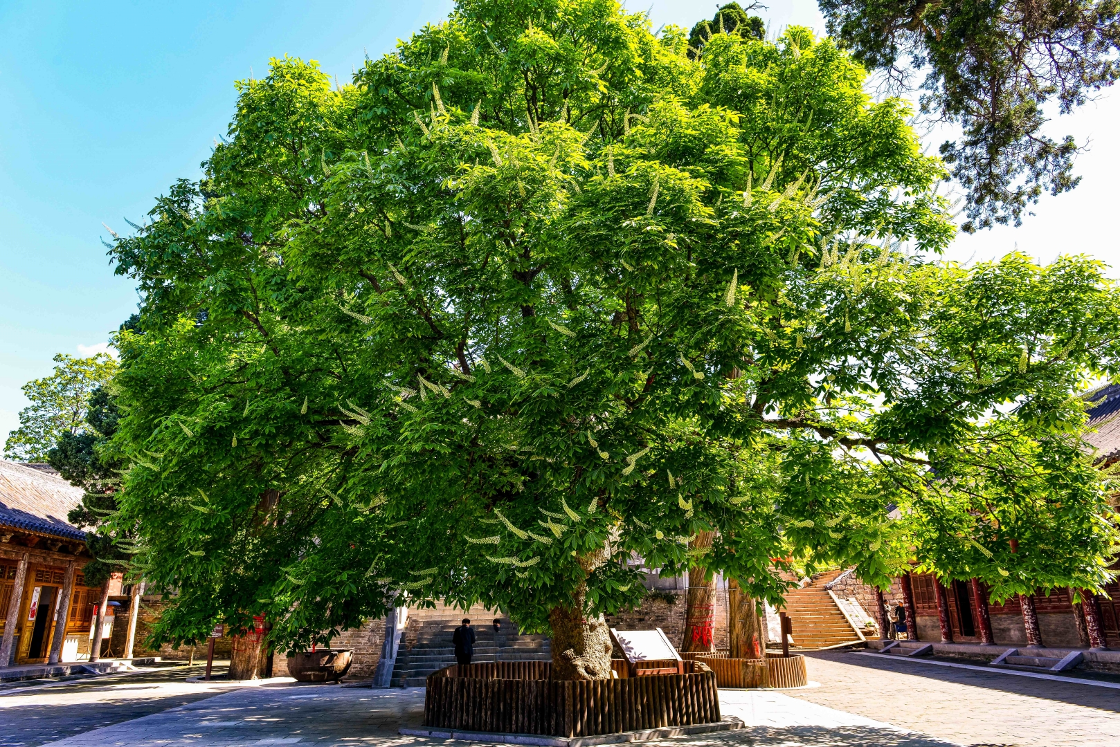 사라수는 수령이 1200여 년에 이르며, 잎자루마다 일곱 장의 작은 잎이 달려 있어 학명으로는 칠엽수(七叶树)라 불립니다. 전해지는 바에 따르면, 이 나무는 사마승정과 옥진공주가 직접 손수 심은 것이라고 합니다. 꽃은 유백색으로 향기가 그윽하며, 모양이 정교한 촛대와 같고, 잎은 손바닥처럼 넓게 퍼져 있습니다. 나무 전체의 모습은 마치 수많은 손이 촛불을 받쳐 든 듯 우아하면서도 생명력이 넘칩니다. 칠엽수는 불교에서 보배로운 나무로 여겨지며, 이 나무가 이 뜰 안에 자라게 된 데에는 중화문화의 포용과 융합 정신을 보여주는 이야기가 전해집니다. 이미 동한 시기부터 외래 문화가 중국에 전해져 본토 문화와 서로 영향을 주고받았으며, 이 뜰에 심어진 사라수는 바로 그 시대의 문화 교류와 조화로운 공존을 상징하는 생생한 증거입니다.