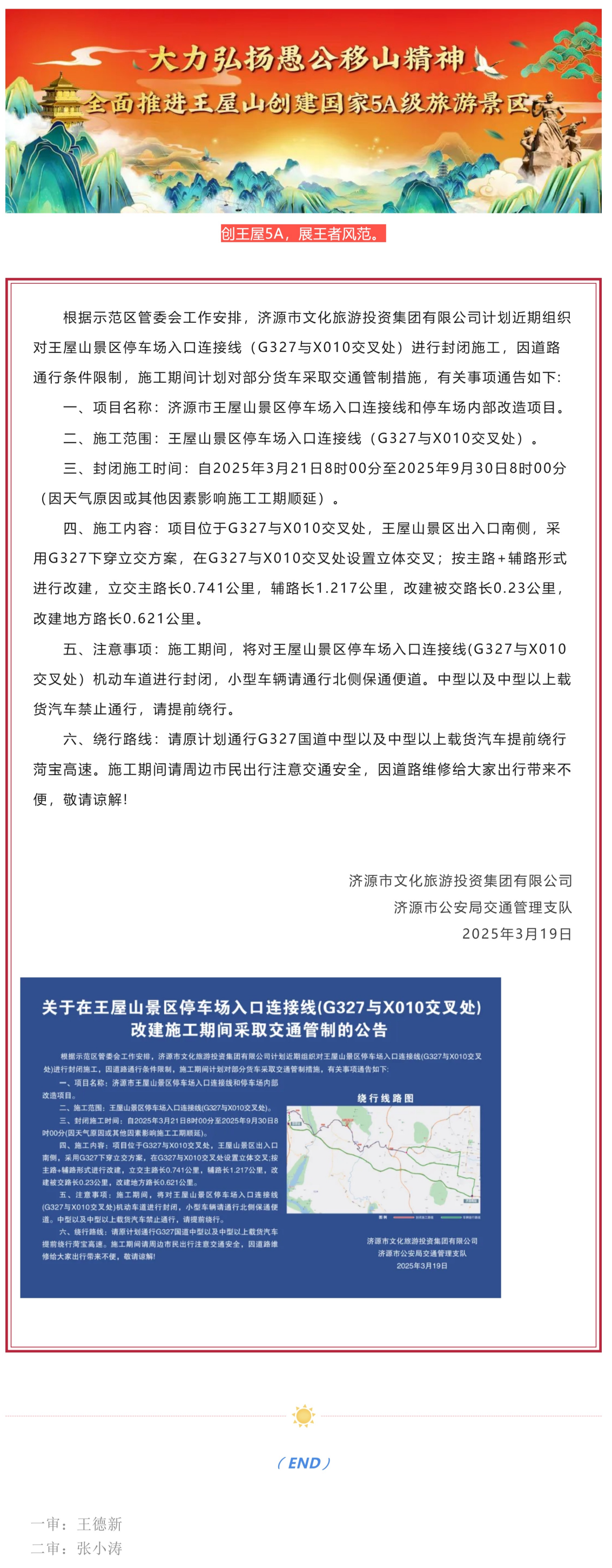 关于在王屋山景区停车场入口连接线(G327与X010交叉处)改建施工期间采取交通管制的公告