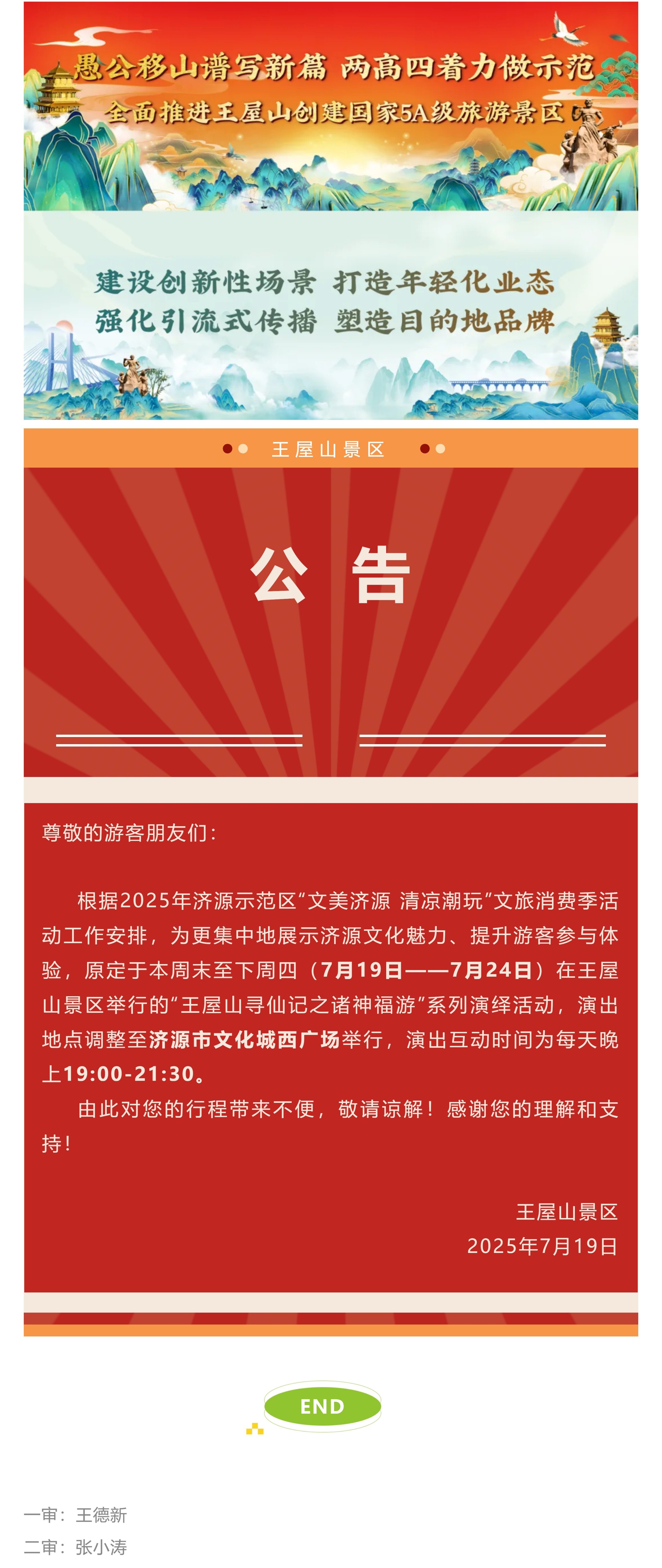 关于王屋山景区暑期活动演出时间及地点调整的公告
